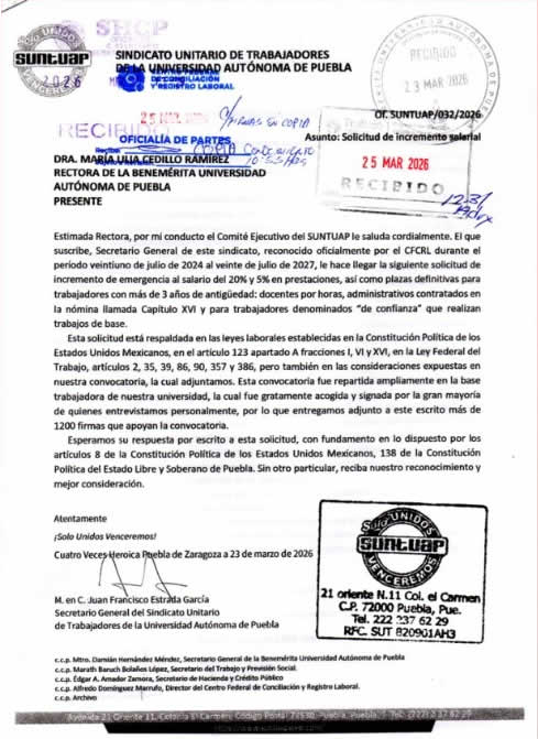 Con la entrega de la solicitud de un aumento de emergencia para las y los trabajadores de la BUAP, —respaldada por más de 1200 firmas—, tanto a la Rectoría y a la Secretaría General de nuestra Universidad, como a las Secretarías de Hacienda y del Trabajo y al Centro Federal de Conciliación y Registro Laboral, el SUNTUAP continúa con la exigencia de que las autoridades cumplan con la ley.